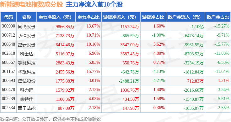 资金流向方面,新能源电池(980027)指数成份股当日主力资金净流出合计55.9亿元,游资资金净流入合计20.02亿元,散户资金净流入合计35.87亿元。成份股资金流向详情见下表: