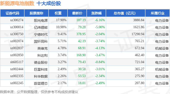 证券之星消息,11月4日,新能源电池(980027)指数报收于3428.92点,跌3.03%,成交673.49亿元,换手率2.68%。当日该指数成份股中,上涨的有11家,同飞股份以9.71%的涨幅领涨,下跌的有39家,申菱环境以6.28%的跌幅领跌。