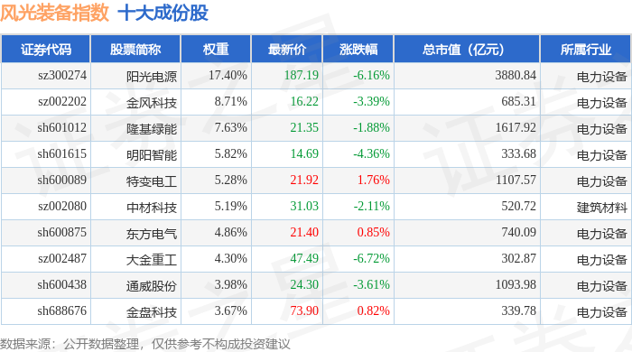 证券之星消息,11月4日,风光装备(980026)指数报收于1762.22点,跌2.58%,成交660.4亿元,换手率3.01%。当日该指数成份股中,上涨的有8家,湘电股份以2.15%的涨幅领涨,下跌的有21家,海力风电以7.51%的跌幅领跌。