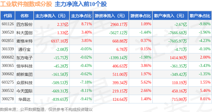 资金流向方面,工业软件(980034)指数成份股当日主力资金净流出合计17.45亿元,游资资金净流入合计6.58亿元,散户资金净流入合计10.87亿元。成份股资金流向详情见下表: