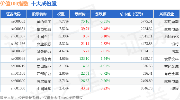 证券之星消息,11月4日,价值100(980081)指数报收于4329.63点,跌0.05%,成交605.08亿元,换手率1.01%。当日该指数成份股中,上涨的有44家,海陆重工以9.98%的涨幅领涨,下跌的有52家,中国外运以4.12%的跌幅领跌。