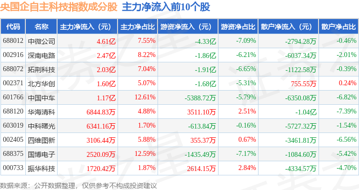 资金流向方面,央国企自主科技(980083)指数成份股当日主力资金净流出合计10.89亿元,游资资金净流出合计1.5亿元,散户资金净流入合计12.39亿元。成份股资金流向详情见下表: