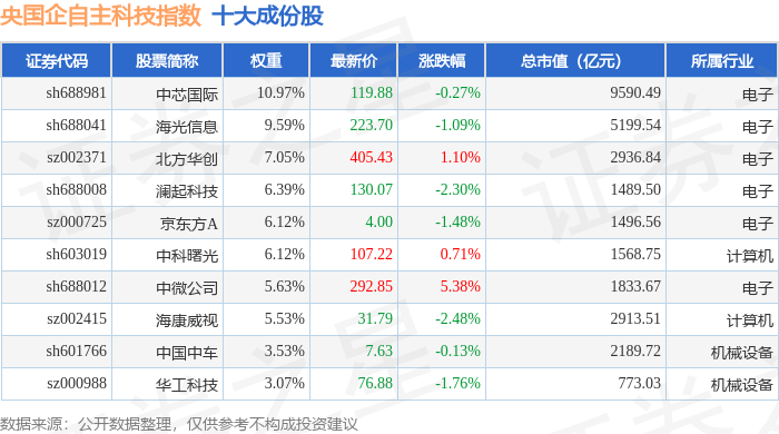 证券之星消息,11月4日,央国企自主科技(980083)指数报收于1811.42点,跌0.4%,成交649.59亿元,换手率1.34%。当日该指数成份股中,上涨的有8家,中微公司以5.38%的涨幅领涨,下跌的有42家,国博电子以4.2%的跌幅领跌。