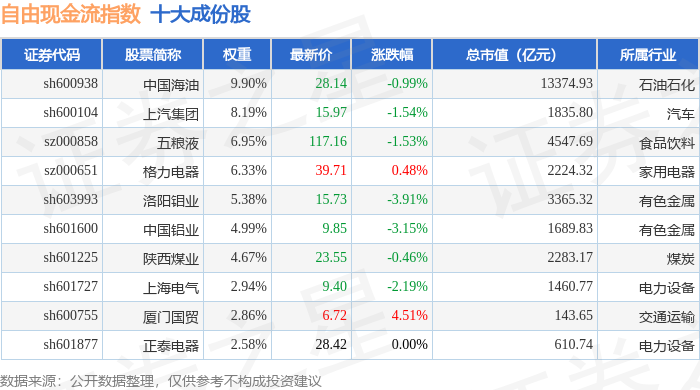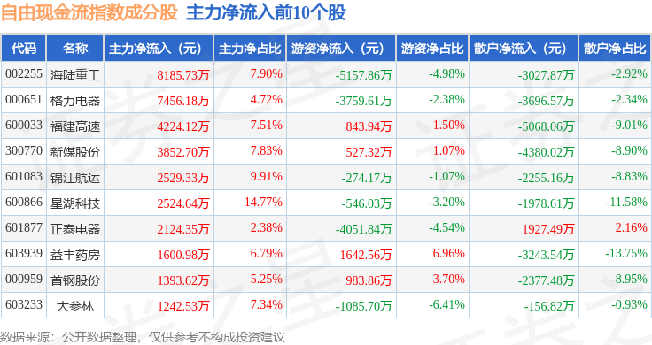 资金流向方面,自由现金流(980092)指数成份股当日主力资金净流出合计50.87亿元,游资资金净流入合计13.24亿元,散户资金净流入合计37.63亿元。成份股资金流向详情见下表: