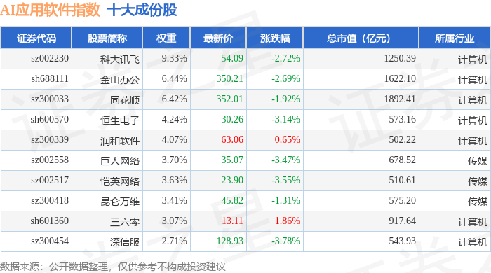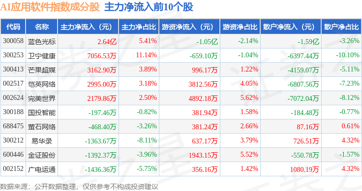 资金流向方面,AI应用软件(980107)指数成份股当日主力资金净流出合计30.99亿元,游资资金净流入合计12.47亿元,散户资金净流入合计18.52亿元。成份股资金流向详情见下表: