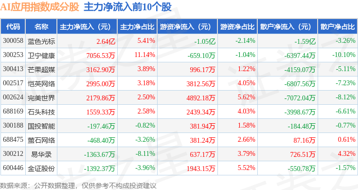 资金流向方面,AI应用(980112)指数成份股当日主力资金净流出合计30.63亿元,游资资金净流入合计13.72亿元,散户资金净流入合计16.91亿元。成份股资金流向详情见下表: