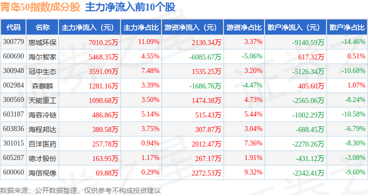 资金流向方面,青岛50(989011)指数成份股当日主力资金净流出合计1.27亿元,游资资金净流入合计1.37亿元,散户资金净流出合计1020.2万元。成份股资金流向详情见下表: