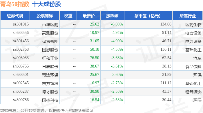 证券之星消息,11月4日,青岛50(989011)指数报收于2425.92点,跌0.49%,成交100.8亿元,换手率1.65%。当日该指数成份股中,上涨的有11家,汇金通以6.06%的涨幅领涨,下跌的有27家,百洋医药以6.08%的跌幅领跌。