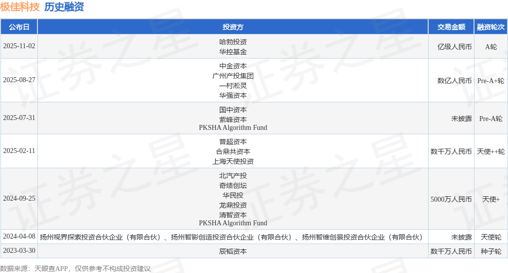 证券之星消息,根据天眼查APP于11月2日公布的信息整理,北京极佳视界科技有限公司A轮融资,融资额亿级人民币,参与投资的机构包括哈勃投资,华控基金。