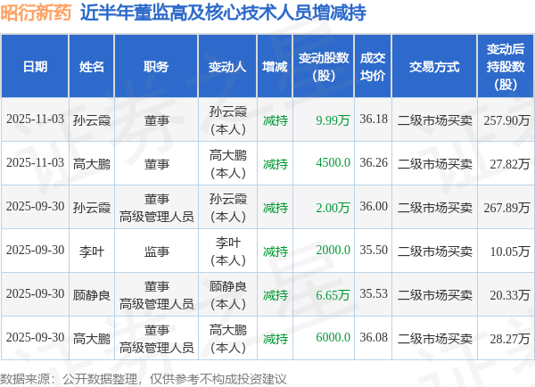 证券之星消息,根据11月4日市场公开信息、上市公司公告及交易所披露数据整理,昭衍新药(603127)最新董监高及相关人员股份变动情况:2025年11月3日公司董事高大鹏、董事孙云霞共减持公司股份10.44万股,占公司总股本为0.0139%。变动期间公司股价下跌2.19%,11月3日当日收盘报36.18元。
