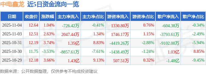 证券之星消息,截至2025年11月4日收盘,中电鑫龙(002298)报收于12.64元,上涨1.04%,换手率20.95%,成交量138.39万手,成交额17.6亿元。