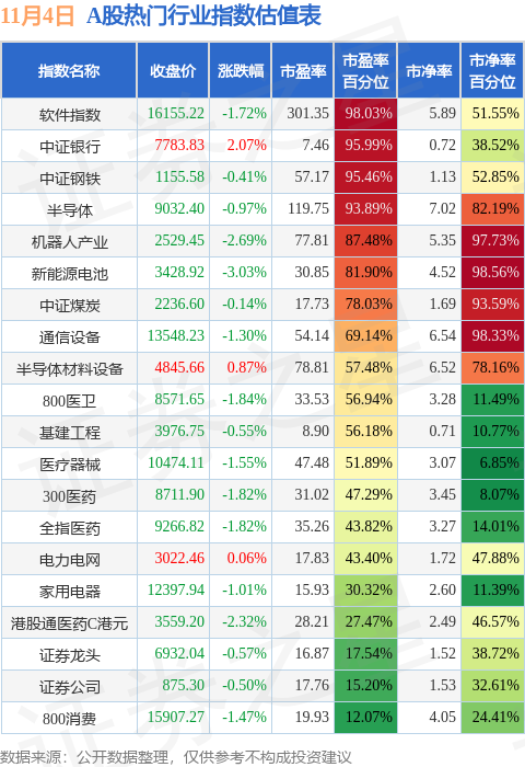 热门行业指数方面,软件指数的市盈率百分位较高,为98.03%。而800消费的市盈率百分位较低,为12.07%。