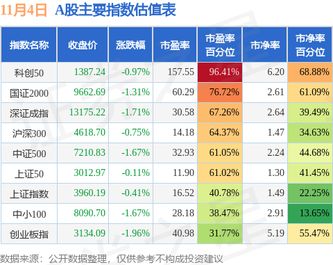 证券之星消息,11月4日A股收盘,上证综指指跌0.41%,报收3960.19点;深圳成指跌1.71%,报收13175.22点;创业板指跌1.96%,报收3134.09点。