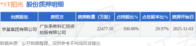 证券之星消息,*ST阳光(000608)11月5日公开信息显示,股东京基集团有限公司向广东承希科汇投资控股有限公司合计质押2.25亿股,占总股本29.97%。质押详情见下表: