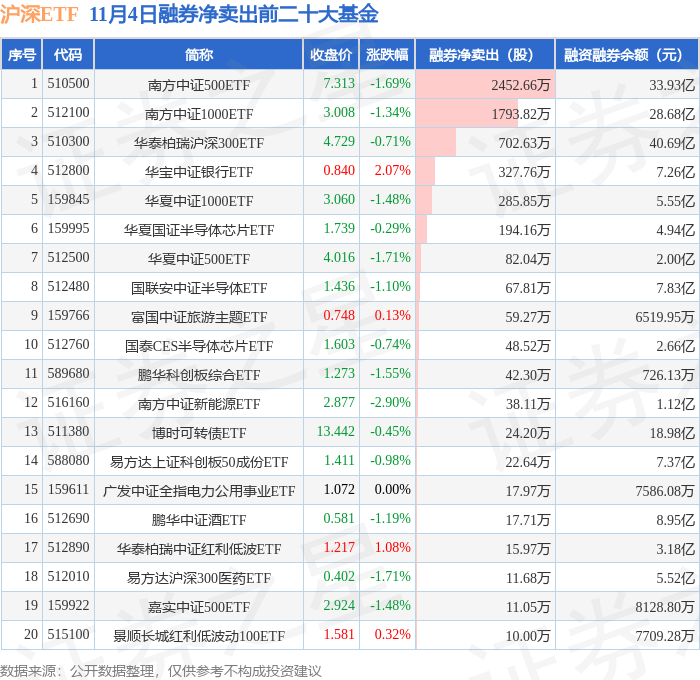 沪深ETF融券净卖出前三分别为:南方中证500ETF(510500)融券净卖出2452.66万股、南方中证1000ETF(512100)融券净卖出1793.82万股、华泰柏瑞沪深300ETF(510300)融券净卖出702.63万股,前20具体见下表: