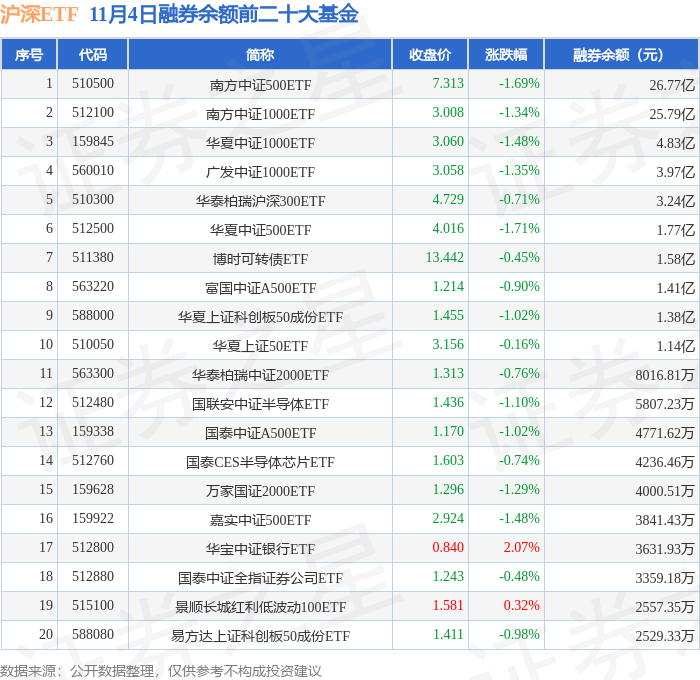 沪深ETF融券余额前三分别为:南方中证500ETF(510500)融券余额26.77亿元、南方中证1000ETF(512100)融券余额25.79亿元、华夏中证1000ETF(159845)融券余额4.83亿元,前20具体见下表: