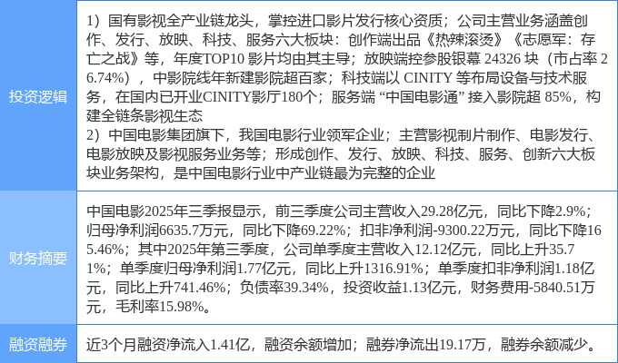 证券之星消息,中国电影11月5日涨停收盘,收盘价17.26元。该股于13点19分涨停,未打开涨停,截止收盘封单资金为1.77亿元,占其流通市值0.55%。