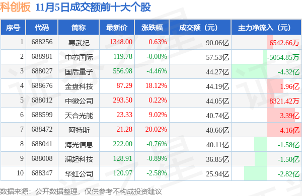 当日科创板成交额前10大个股中5只个股收涨,平均涨幅9.6%,其中寒武纪(688256)以成交额90.06亿元排第一。从主力资金流入看,成交额前10大个股中有5只个股呈现主力资金净流入。