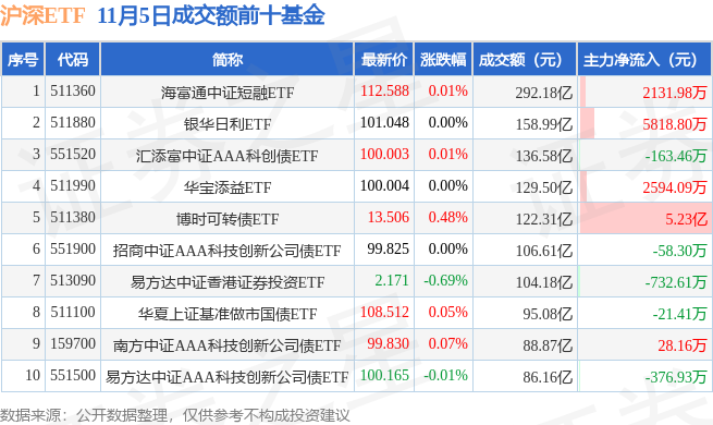 当日沪深ETF成交额前10大ETF基金中5只ETF基金收涨,平均涨幅0.12%,其中短融ETF(511360)以成交额292.18亿元排第一。从主力资金流入看,成交额前10大ETF基金中有5只ETF基金呈现主力资金净流入。