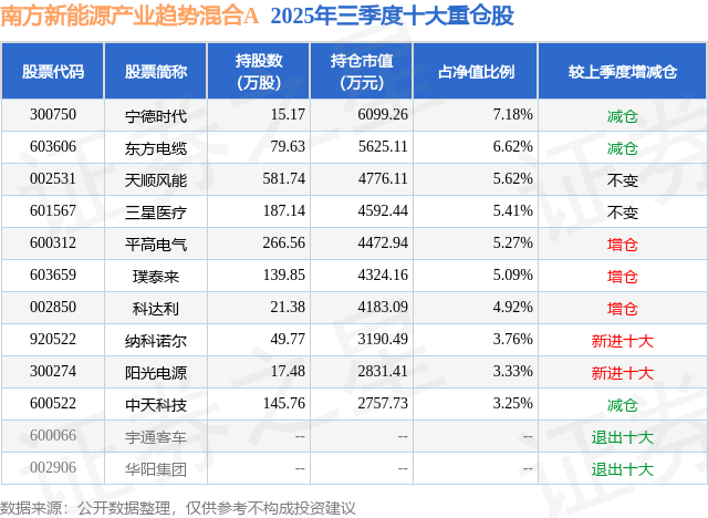 根据2025基金Q3季报公募基金重仓股数据,重仓该股的公募基金共9家,其中持有数量最多的公募基金为南方基金的南方新能源产业趋势混合A。南方新能源产业趋势混合A目前规模为7.33亿元,最新净值0.7666(11月4日),较上一交易日下跌2.07%,近一年上涨15.98%。该公募基金现任基金经理为熊琳。