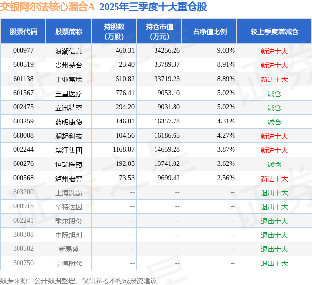 根据2025基金Q3季报公募基金重仓股数据,重仓该股的公募基金共24家,其中持有数量最多的公募基金为交银施罗德基金的交银阿尔法核心混合A。交银阿尔法核心混合A目前规模为37.17亿元,最新净值3.6862(11月4日),较上一交易日下跌0.75%,近一年上涨31.29%。该公募基金现任基金经理为何帅。何帅在任的基金产品包括:交银优势行业混合,管理时间为2015年7月9日至今,期间收益率为235.53%;交银持续成长主题混合A,管理时间为2018年1月12日至今,期间收益率为135.4%;交银瑞和三年持有期混合,管理时间为2022年3月2日至今,期间收益率为7.59%。
