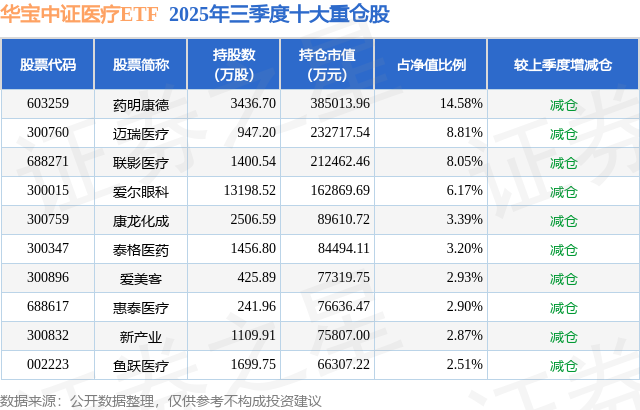 根据2025基金Q3季报公募基金重仓股数据,重仓该股的公募基金共81家,其中持有数量最多的公募基金为华宝基金的华宝中证医疗ETF。华宝中证医疗ETF目前规模为264.04亿元,最新净值0.3618(11月4日),较上一交易日下跌1.79%,近一年上涨5.91%。该公募基金现任基金经理为胡洁。胡洁在任的基金产品包括:华宝中证银行ETF联接A,管理时间为2012年10月16日至今,期间收益率为179.76%;华宝医疗ETF联接A,管理时间为2015年5月21日至今,期间收益率为-59.27%;华宝中证军工ETF,管理时间为2016年8月5日至今,期间收益率为39.74%;华宝中证银行ETF,管理时间为2017年7月18日至今,期间收益率为63.69%。