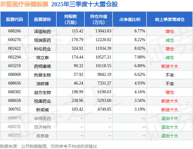 根据2025基金Q3季报公募基金重仓股数据,重仓该股的公募基金共6家,其中持有数量最多的公募基金为农银汇理基金的农银医疗保健股票。农银医疗保健股票目前规模为14.87亿元,最新净值1.7118(11月4日),较上一交易日下跌3.02%,近一年上涨16.94%。该公募基金现任基金经理为梦圆。梦圆在任的基金产品包括:农银汇理创新医疗混合,管理时间为2021年2月24日至今,期间收益率为-44.05%。
