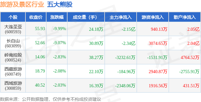 个股表现方面,旅游及景区行业当日领跌股为大连圣亚(600593),该股当日报收55.93,下跌9.99%,成交量24.18万,主力资金净流出2.15亿元。长白山(603099)以下跌9.07%紧随其后,该股当日成交量30.89万,主力资金净流出2.34亿元。除此之外,岭南控股(000524)、西藏旅游(600749)、西域旅游(300859)均进入当日熊股之列。具体个股列表见下表: