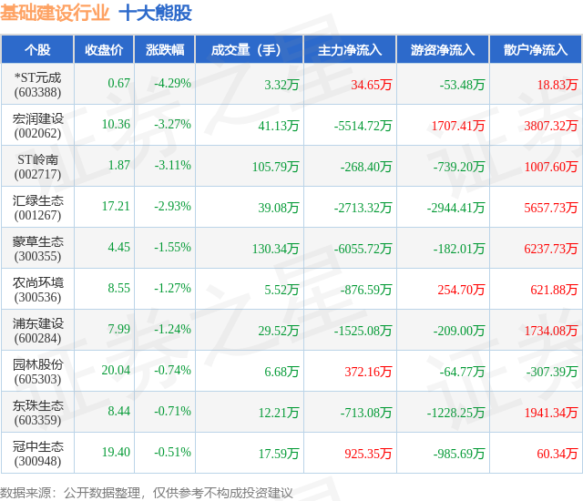 个股表现方面,基础建设行业当日领跌股为*ST元成(603388),该股当日报收0.67,下跌4.29%,成交量3.32万,主力资金净流入34.65万元。宏润建设(002062)以下跌3.27%紧随其后,该股当日成交量41.13万,主力资金净流出5514.72万元。除此之外,ST岭南(002717)、汇绿生态(001267)、蒙草生态(300355)均进入当日熊股之列。具体个股列表见下表: