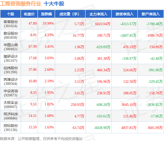 个股表现方面,工程咨询服务行业当日领涨股为霍普股份(301024),该股当日报收47.89,上涨19.99%,成交量5.73万,主力资金净流入6022.04万元。勘设股份(603458)以上涨4.33%紧随其后,该股当日成交量16.77万,主力资金净流入180.71万元。除此之外,华图山鼎(300492)、建研设计(301167)、经纬股份(301390)均进入当日牛股之列。具体个股列表见下表: