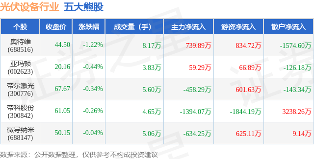 个股表现方面,光伏设备行业当日领跌股为奥特维(688516),该股当日报收44.5,下跌1.22%,成交量8.17万,主力资金净流入739.89万元。亚玛顿(002623)以下跌0.44%紧随其后,该股当日成交量3.83万,主力资金净流入59.29万元。除此之外,帝尔激光(300776)、帝科股份(300842)、微导纳米(688147)均进入当日熊股之列。具体个股列表见下表: