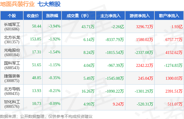 个股表现方面,地面兵装行业当日领跌股为长城军工(601606),该股当日报收50.44,下跌3.94%,成交量43.71万,主力资金净流出2.26亿元。北方长龙(301357)以下跌1.92%紧随其后,该股当日成交量6.14万,主力资金净流出8337.79万元。除此之外,光电股份(600184)、国科军工(688543)、捷强装备(300875)均进入当日熊股之列。具体个股列表见下表: