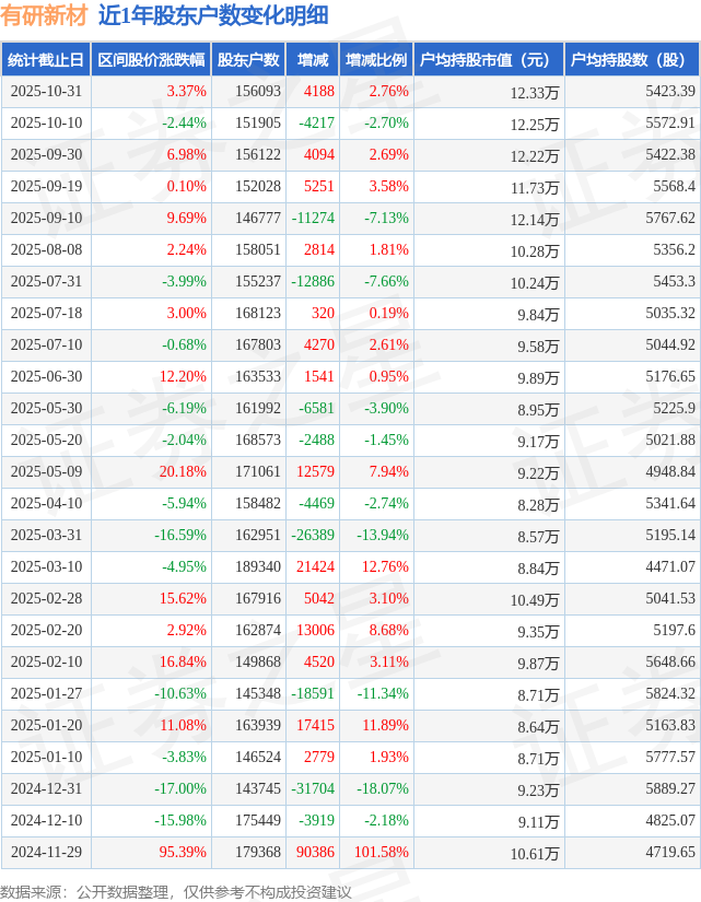 从股价来看,2025年10月10日至2025年10月31日,有研新材区间涨幅为3.37%,在此期间股东户数增加4188.0户,增幅为2.76%。