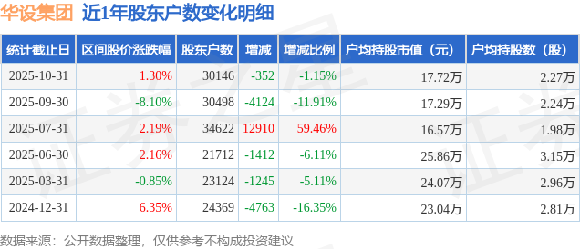 从股价来看,2025年9月30日至2025年10月31日,华设集团区间涨幅为1.3%,在此期间股东户数减少352.0户,减幅为1.15%。