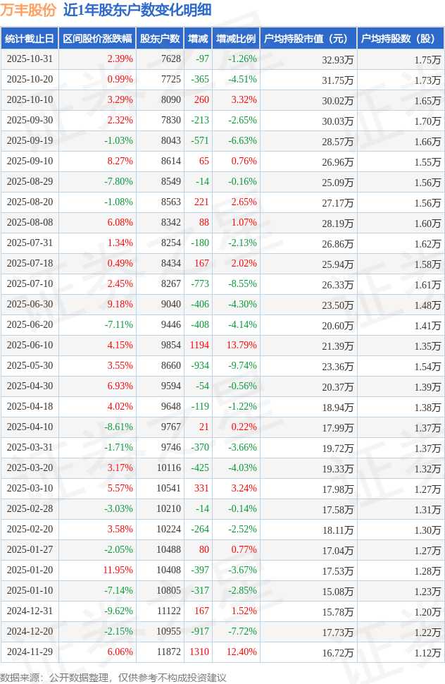 从股价来看,2025年10月20日至2025年10月31日,万丰股份区间涨幅为2.39%,在此期间股东户数减少97.0户,减幅为1.26%。