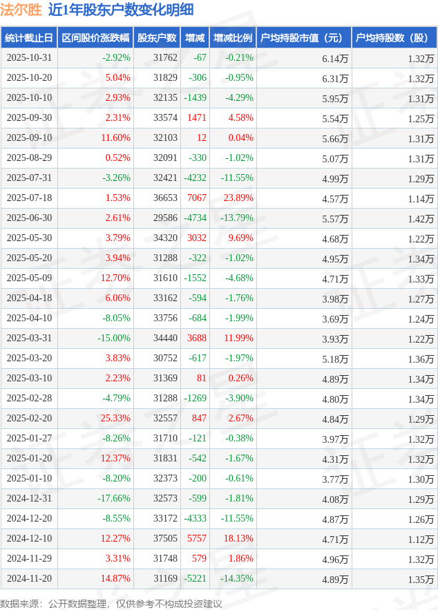 从股价来看,2025年10月20日至2025年10月31日,法尔胜区间跌幅为2.92%,在此期间股东户数减少67.0户,减幅为0.21%。