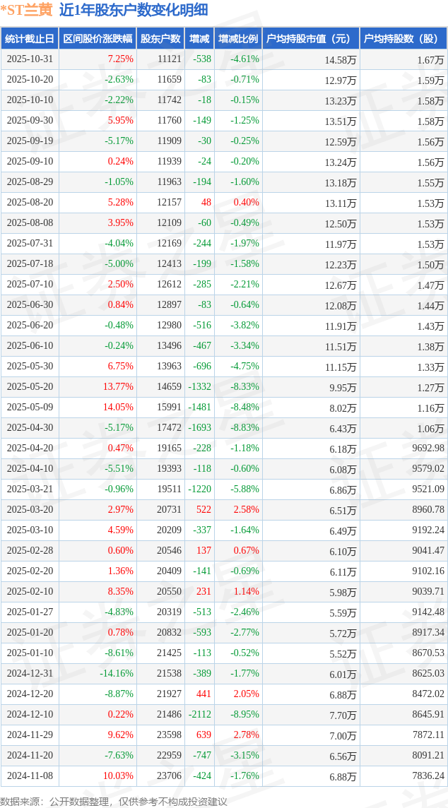 从股价来看,2025年10月20日至2025年10月31日,*ST兰黄区间涨幅为7.25%,在此期间股东户数减少538.0户,减幅为4.61%。