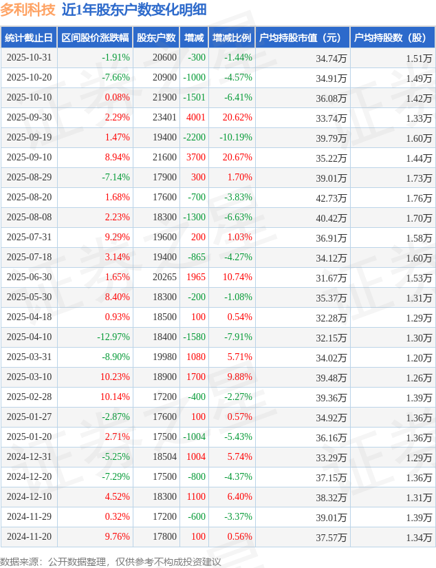 从股价来看,2025年10月20日至2025年10月31日,多利科技区间跌幅为1.91%,在此期间股东户数减少300.0户,减幅为1.44%。