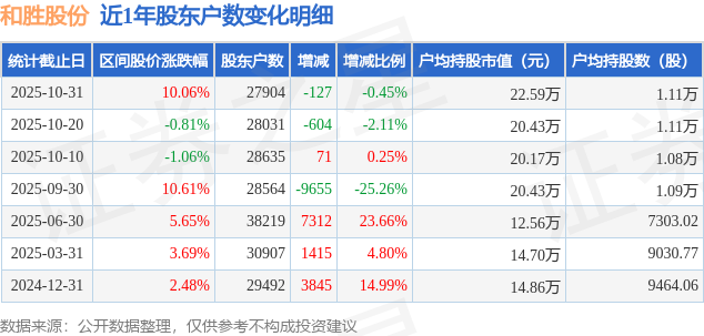 从股价来看,2025年10月20日至2025年10月31日,和胜股份区间涨幅为10.06%,在此期间股东户数减少127.0户,减幅为0.45%。