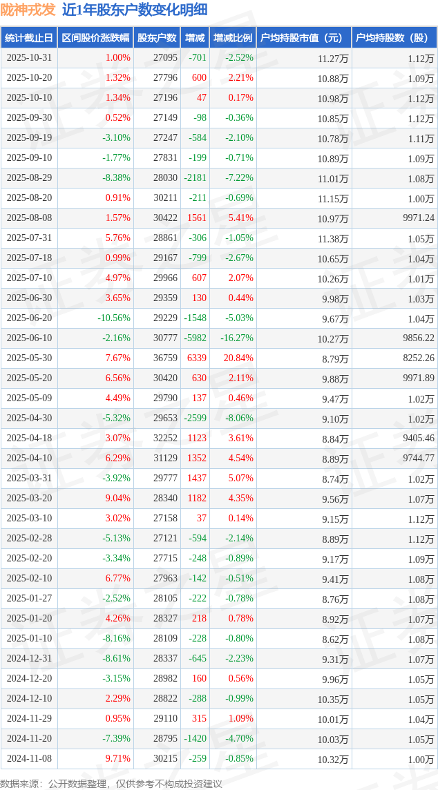 从股价来看,2025年10月20日至2025年10月31日,陇神戎发区间涨幅为1.0%,在此期间股东户数减少701.0户,减幅为2.52%。