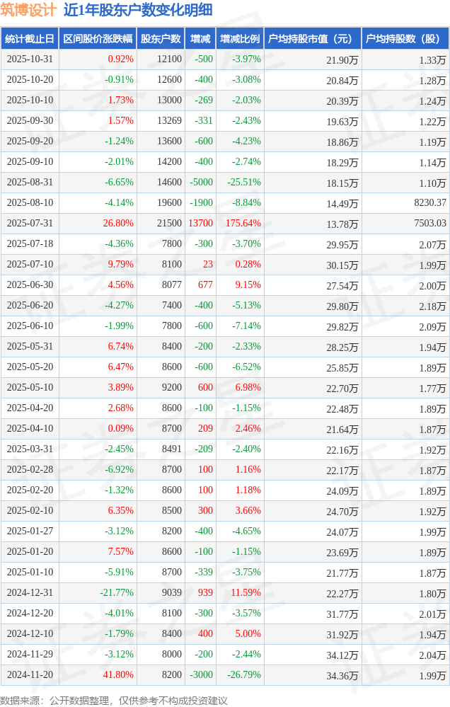 从股价来看,2025年10月20日至2025年10月31日,筑博设计区间涨幅为0.92%,在此期间股东户数减少500.0户,减幅为3.97%。