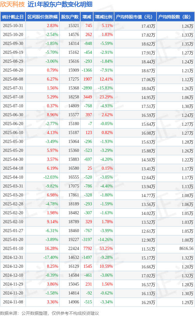 从股价来看,2025年10月20日至2025年10月31日,欣天科技区间涨幅为2.83%,在此期间股东户数增加745.0户,增幅为5.11%。