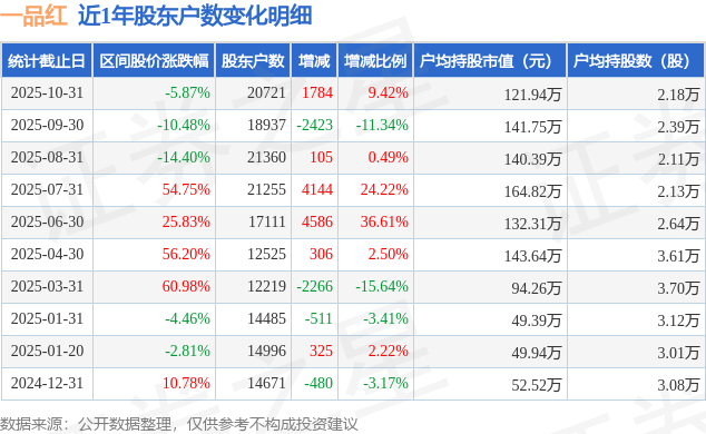 从股价来看,2025年9月30日至2025年10月31日,一品红区间跌幅为5.87%,在此期间股东户数增加1784.0户,增幅为9.42%。
