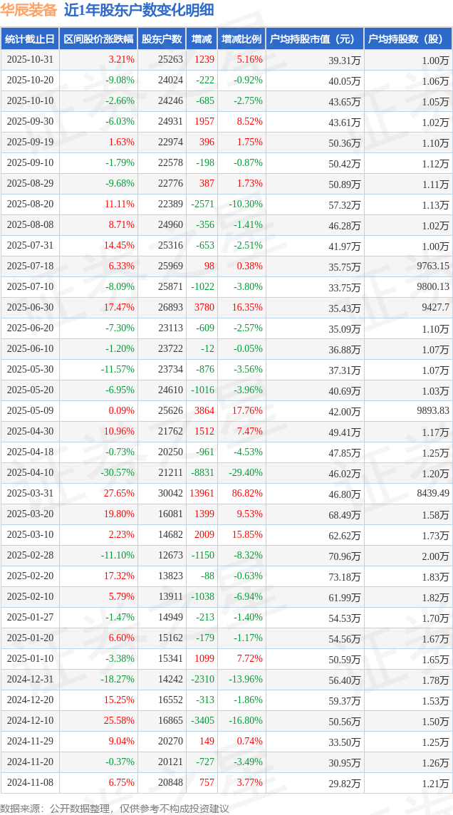 从股价来看,2025年10月20日至2025年10月31日,华辰装备区间涨幅为3.21%,在此期间股东户数增加1239.0户,增幅为5.16%。
