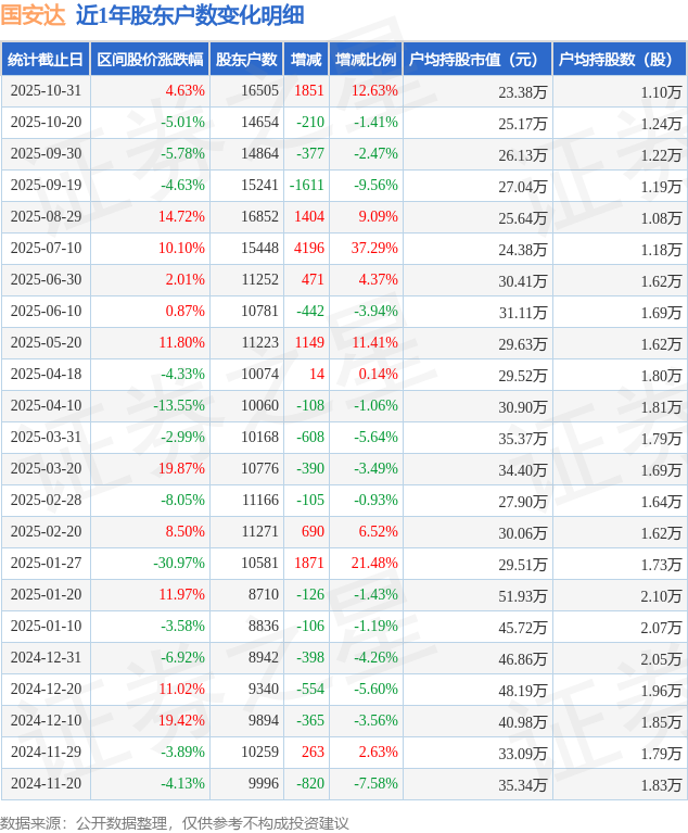 从股价来看,2025年10月20日至2025年10月31日,国安达区间涨幅为4.63%,在此期间股东户数增加1851.0户,增幅为12.63%。