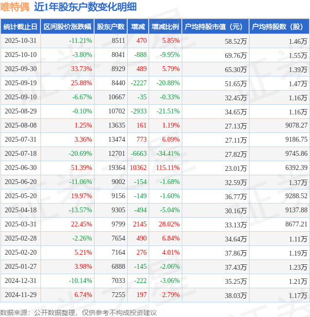 从股价来看,2025年10月10日至2025年10月31日,唯特偶区间跌幅为11.21%,在此期间股东户数增加470.0户,增幅为5.85%。