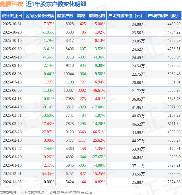 从股价来看,2025年10月20日至2025年10月31日,趣睡科技区间涨幅为7.37%,在此期间股东户数增加425.0户,增幅为5.0%。
