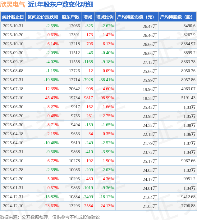 从股价来看,2025年10月20日至2025年10月31日,欣灵电气区间跌幅为2.59%,在此期间股东户数减少325.0户,减幅为2.62%。