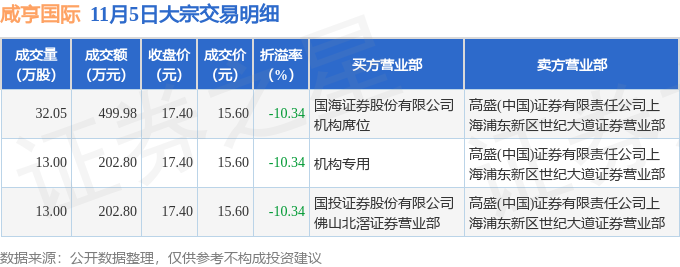 证券之星消息,11月5日咸亨国际发生大宗交易,交易数据如下: