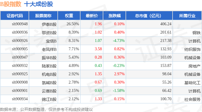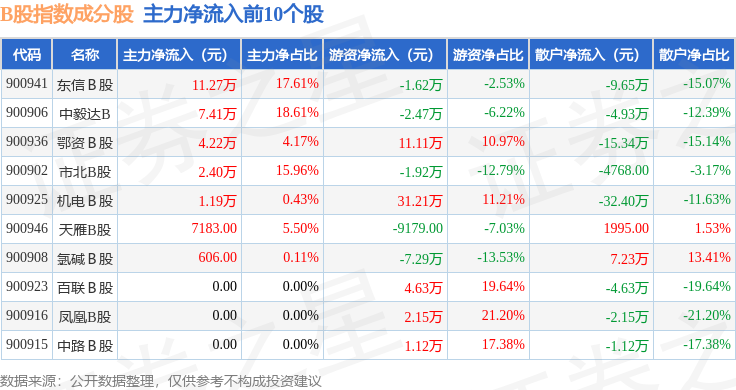 资金流向方面,B股指数(000003)成份股当日主力资金净流入合计0.66万元,游资资金净流出合计97.04万元,散户资金净流入合计96.38万元。成份股资金流向详情见下表: